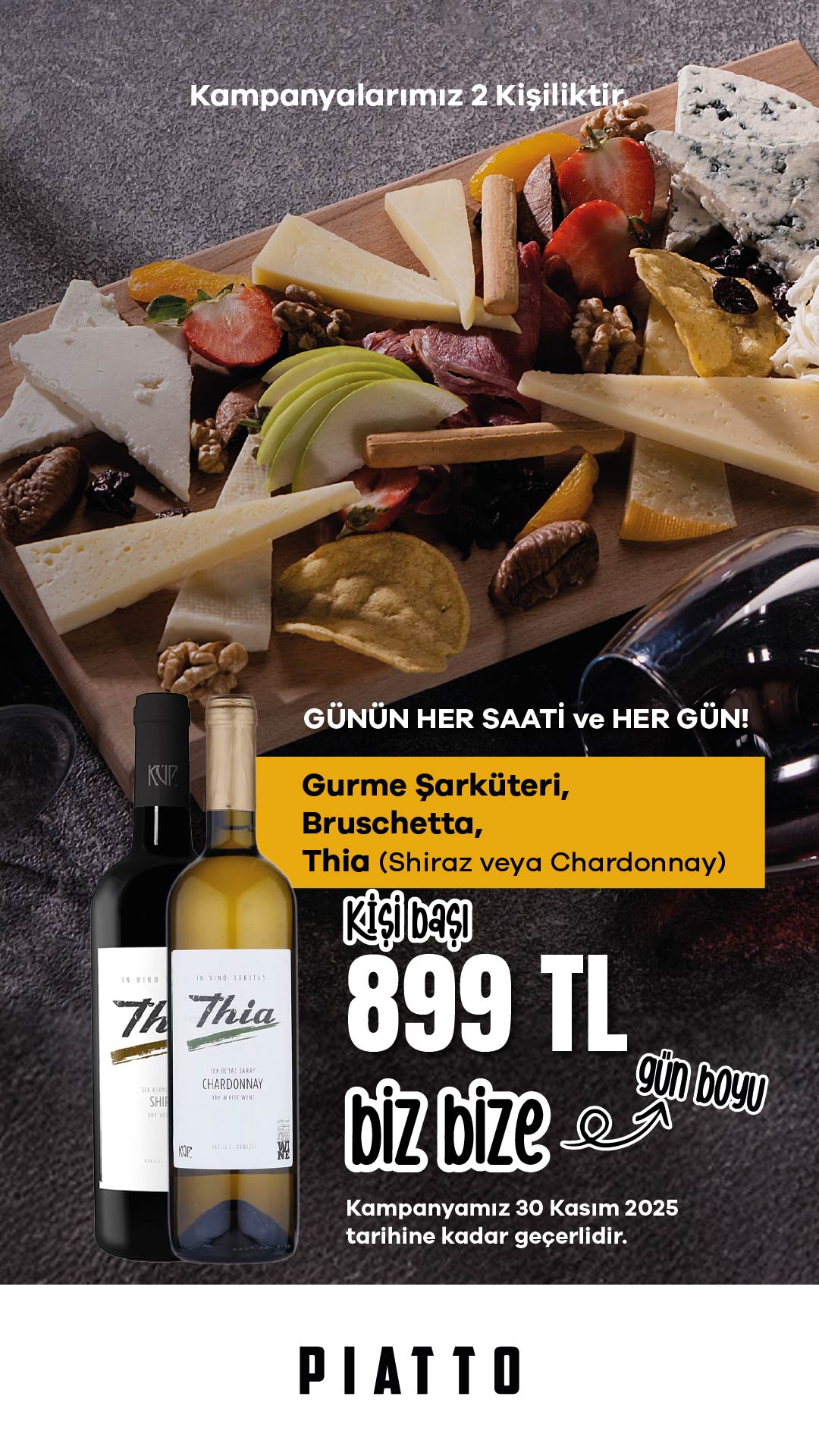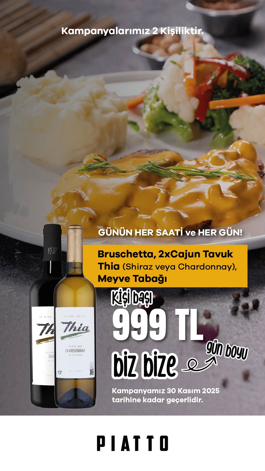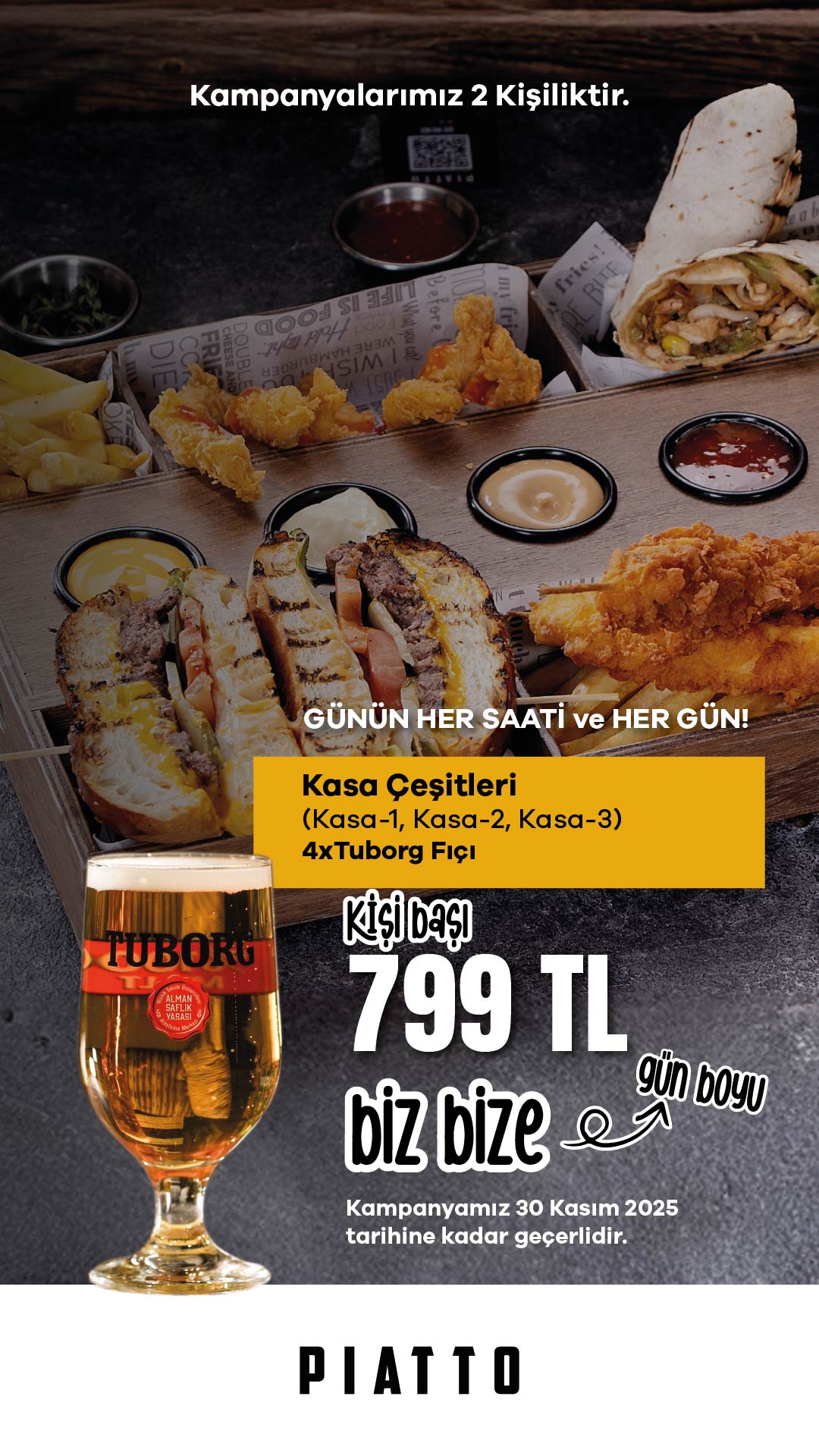 Özel çıtır kaplamalı çıtır tavuk, parmak patates, cheddar topları, çıtır jalapone, çıtır pop, sigara böreği, sosis, sweet-chili sos ve piatto sos eşliğinde