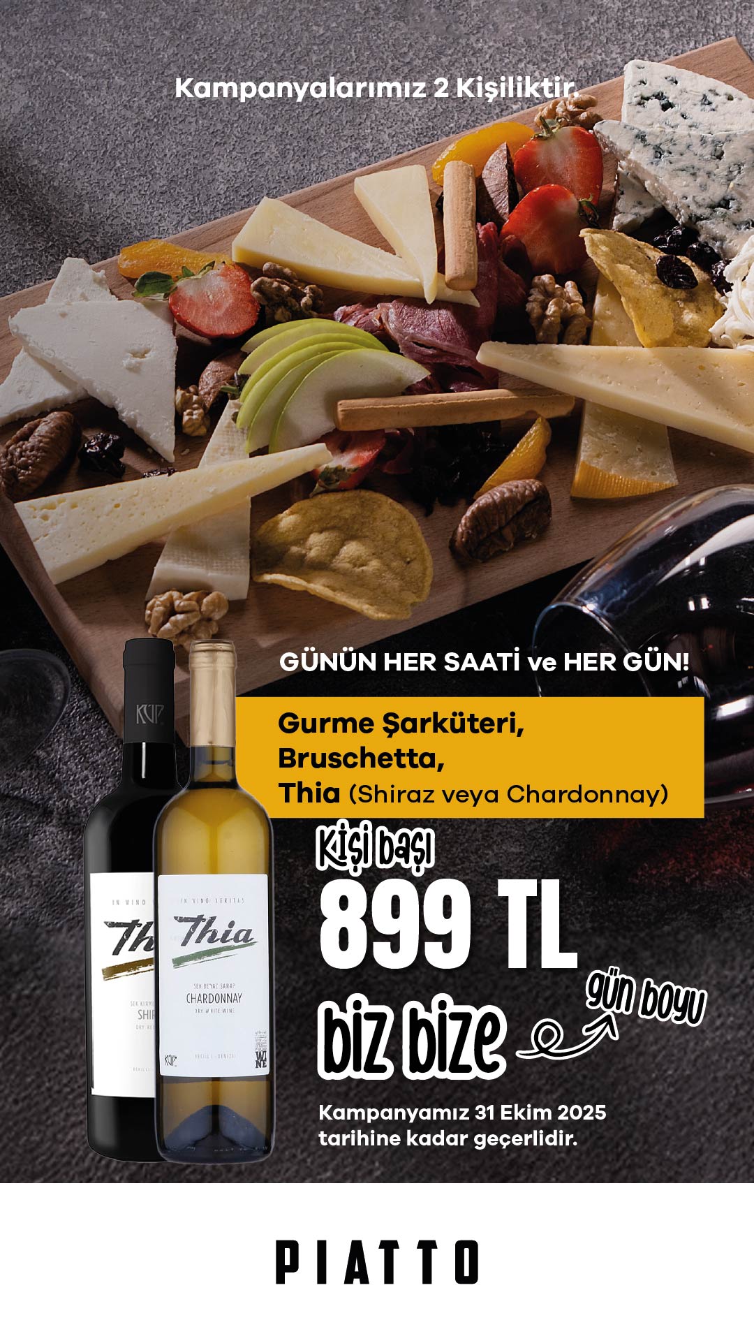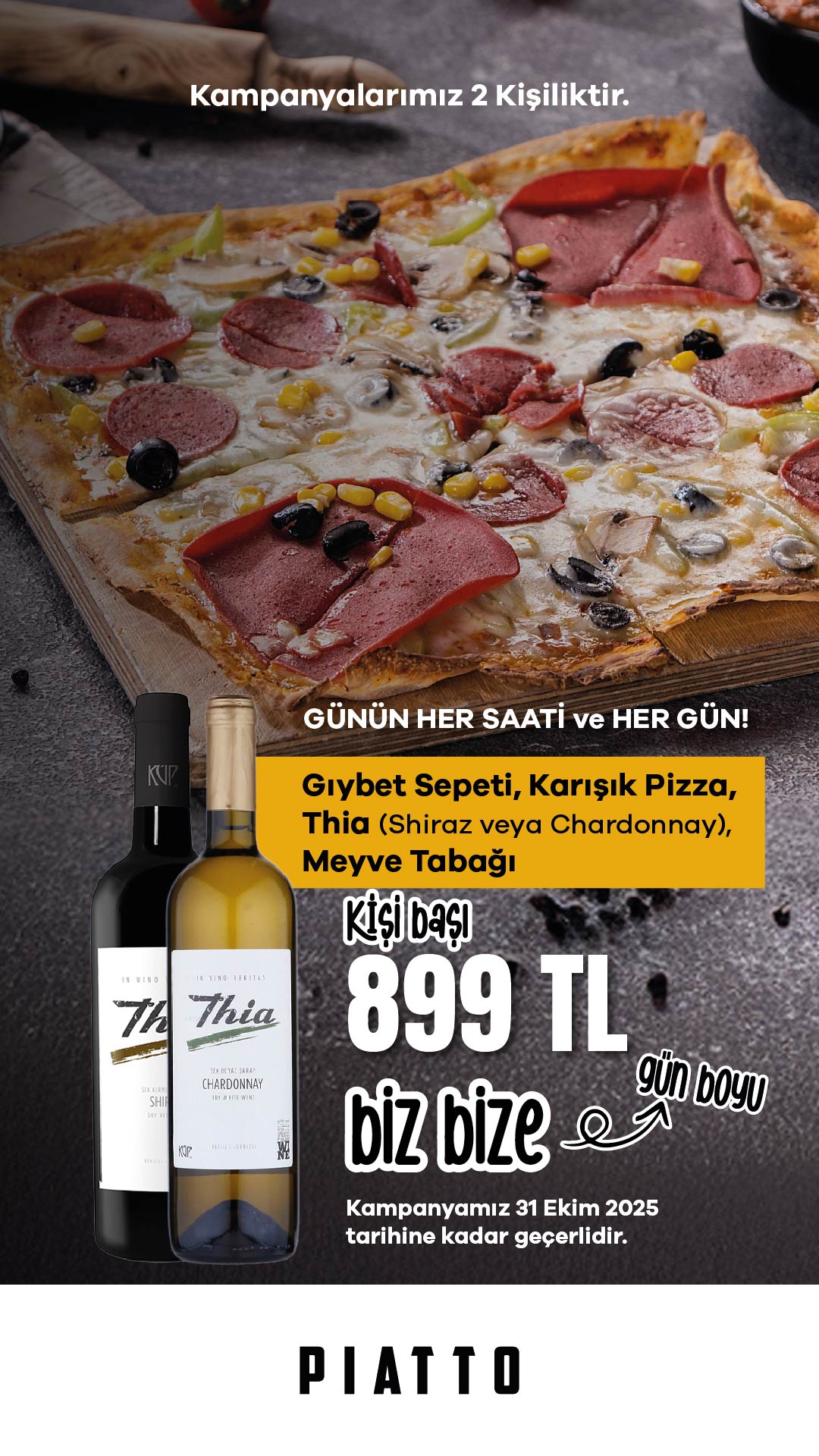 Özel çıtır kaplamalı çıtır tavuk, parmak patates, cheddar topları, çıtır jalapone, çıtır pop, sigara böreği, sosis, sweet-chili sos ve piatto sos eşliğinde